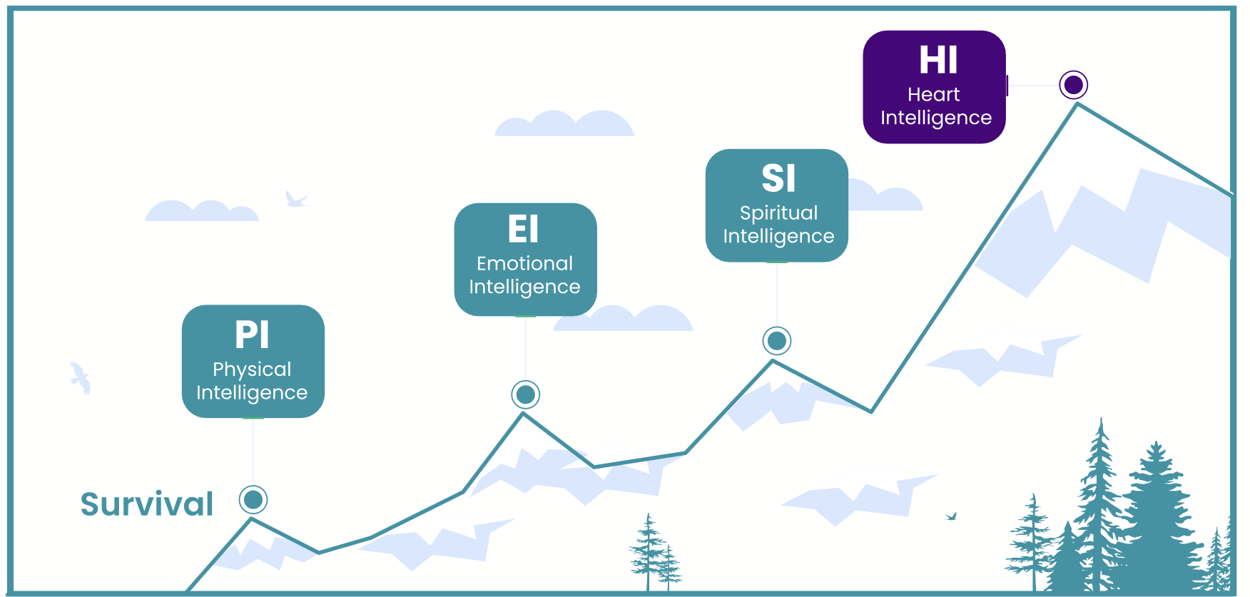 As we develop skills in various aspects of ourselves, our capacity or intelligence expands. Physical Intelligence (PQ) balances brain, sleep, and bodily functions. Emotional Intelligence (EQ) recognizes needs and fosters effective communication, while Cognitive Intelligence (IQ) encompasses reflection, learning, evidence gathering, and information processing. Heart Intelligence (HQ) embodies goodwill and service.